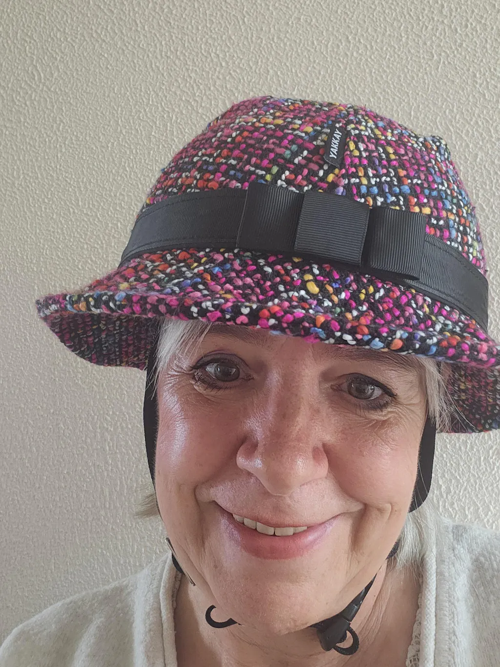 The Tokyo Pink Jazz helmet hat is an elegant tweed-style bicycle helmet hat from YAKKAY.
